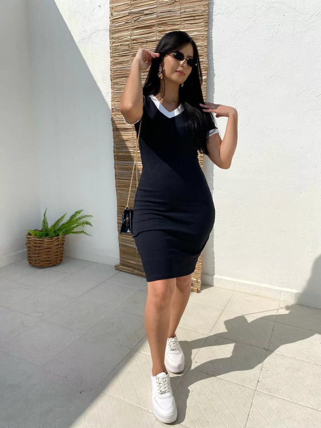 Vestido tubinho justo confeccionado em ribana canelada com composição de algodão e elastano, tecido de alta elasticidade e bom conforto termico. Comprimento na altura do joelho modelagem padrão.